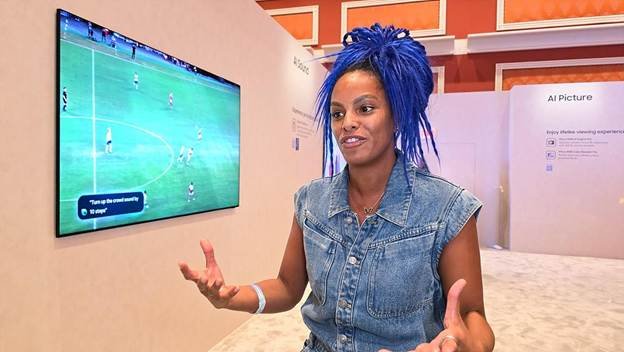Màn trình diễn Vision AI tập trung vào khả năng tương tác tiện lợi. Thông qua điều khiển giọng nói, khách tham quan có thể tra cứu dự đoán trận đấu, tìm công thức nấu ăn hay phát nhạc – minh họa cách chiếc TV vận hành đúng nghĩa như một người bạn đồng hành giải trí thực thụ.