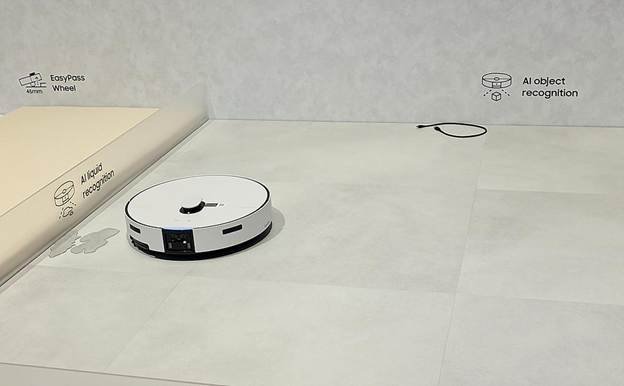 Robot hút bụi lau nhà Bespoke AI Jet Bot Steam Ultra ứng dụng AI để nhận diện đồ vật và chất lỏng, thông minh phân biệt nội thất, dây cáp, thậm chí cả chất lỏng trong suốt hay có màu, rồi làm sạch hoặc tránh né theo thiết lập của người dùng. Công nghệ EasyPass Wheel giúp robot dễ dàng vượt qua bậc cửa và thảm dày tới 60 mm, trong khi chổi quét cạnh và đệm lau hỗ trợ làm sạch sát các góc và tường.