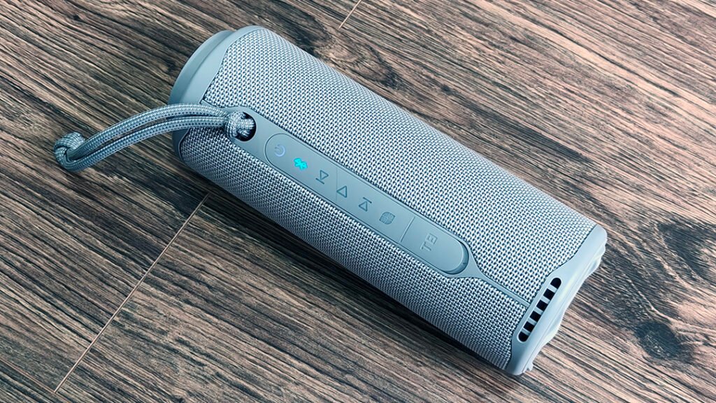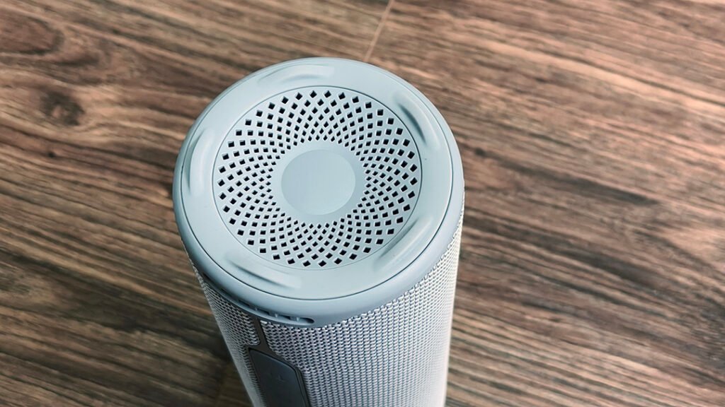 Thiết kế nhỏ gọn giúp loa dễ dàng mang theo. Ở mặt trên là vòng xoay điều chỉnh âm lượng – một chi tiết rất tiện lợi trong quá trình sử dụng, dù về lâu dài có thể cần độ bền cao hơn. Xung quanh vòng xoay này là một dải đèn RGB nhỏ, chỉ thực sự dễ nhận thấy trong điều kiện ánh sáng yếu. Phong cách thiết kế tối giản, không phô trương.