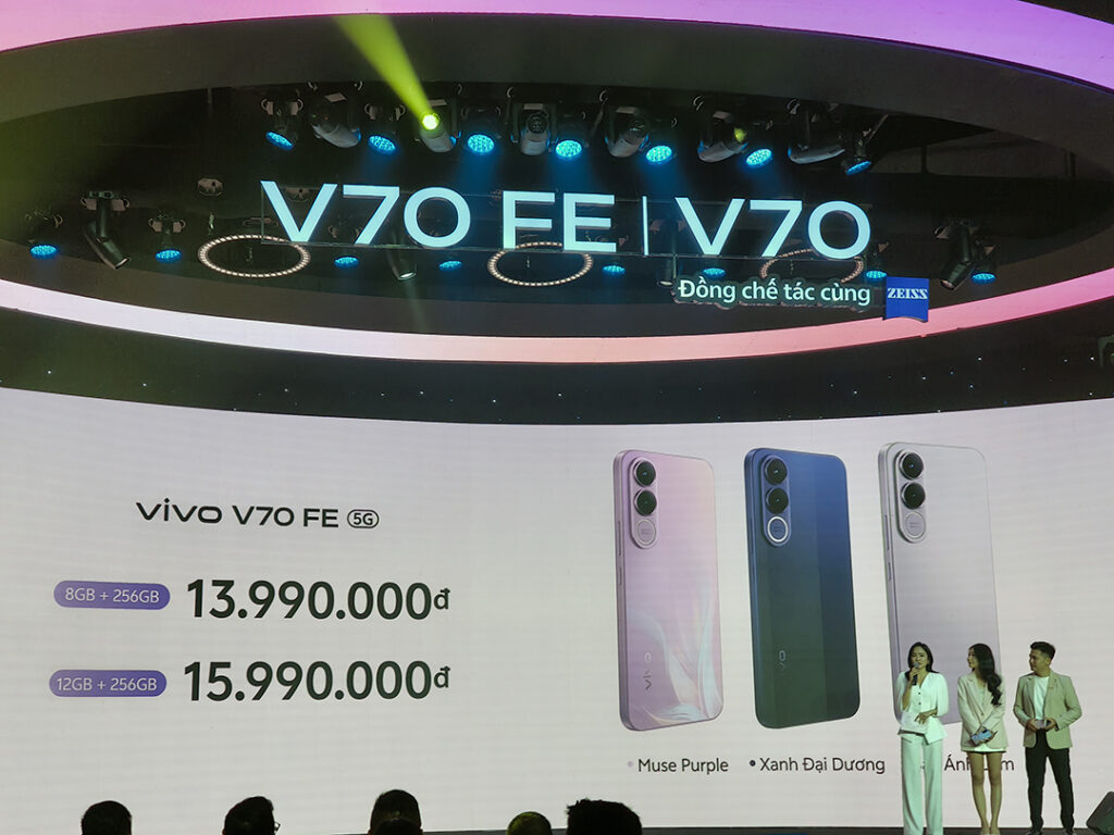 vivo V70 và vivo V70 FE sẽ chính thức được mở bán tại hệ thống cửa hàng Thế Giới Di Động và Điện Máy Xanh trên toàn quốc. Người dùng sẽ có thêm nhiều lựa chọn với vivo V70 FE, phiên bản (8+256GB) có giá 13.990.000 đồng và phiên bản (12+256GB) có giá 15.990.000 đồng. Trong khi đó, vivo V70 phiên bản (8+256GB) có giá 17.990.000 đồng và phiên bản (12+256GB) có giá 19.990.000 đồng.