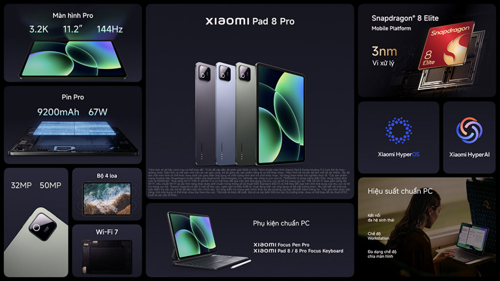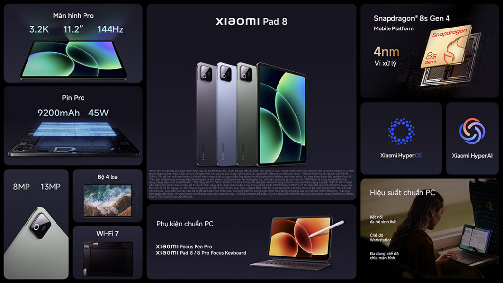 Xiaomi chính thức ra mắt Xiaomi Pad 8 Series tại Việt Nam – thế hệ máy tính bảng cao cấp mới với thông điệp “Hiệu suất toàn năng”. Xiaomi Pad 8 Series hướng đến nhóm người dùng hiện đại, đang tìm kiếm một thiết bị mạnh mẽ cho công việc nhưng vẫn đảm bảo tính linh hoạt. Sở hữu hiệu năng vượt trội từ các vi xử lý Snapdragon 8 Elite hàng đầu, màn hình 3.2K 144Hz sắc nét, dung lượng pin lớn 9200mAh cùng hệ sinh thái phụ kiện cao cấp, Xiaomi Pad 8 Series được phát triển để mang đến trải nghiệm hiệu suất chuẩn PC cho người dùng hiện đại, từ xử lý văn bản, họp trực tuyến cho đến sáng tạo nội dung.